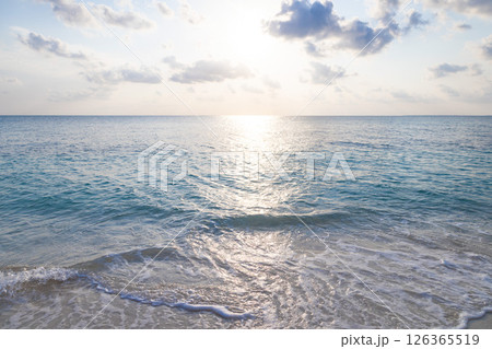 夕陽西下,海岸邊湛藍的海水,在宮古島長濱海灘的沙灘上度假(沖繩縣宮古市)