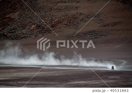 一輛紅色汽車在揚起灰塵時越野行駛的插圖(土質未鋪砌的道路)