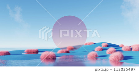 3d render Surreal pastel landscape background with geometric shapes, abstract fantastic desert dune in seasoning landscape with arches, panoramic, futuristic scene with copy space, blue sky and cloudy