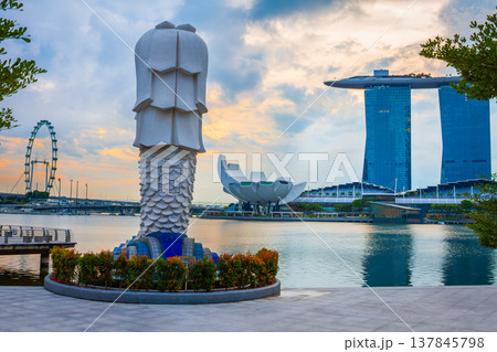 Panorama landscape of Singapore business district and city with modern building at sunset time. Singapore skyline