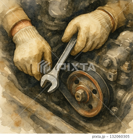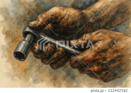 工人油手握棘輪扳手特寫水彩插畫