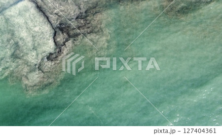Amazing top view beautiful seashore, Aerial view crashing waves on rocks, Dark sea surface seashore rocks cliffs background