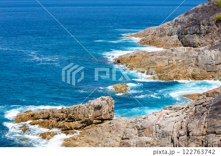 Turquoise ocean sea water white wave pattern splashing deep blue sea. Seascape dark ocean background wave splash on rock. Tropical sea beach in summer seaside outdoor. Water Surface blue wave pattern