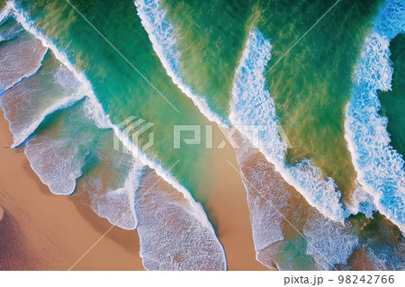 Aerial view of sea crashing waves White foaming waves on beach sand, Top view beach seascape view Nature sea ocean background