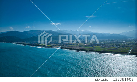 日本富山縣黑部川沖積扇和海岸線的積雪略為融化。