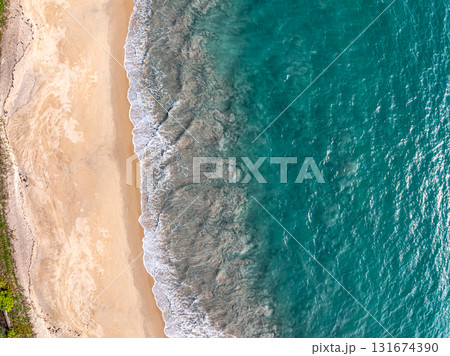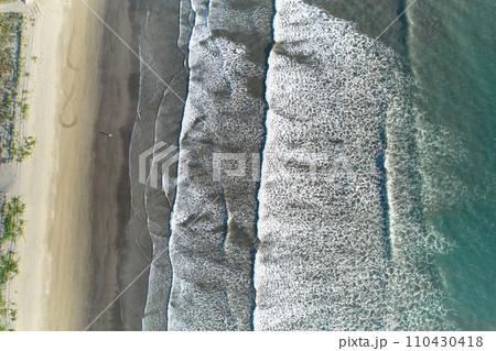 Aerial view sandy beach and waves Beautiful tropical sea in the morning summer season image by Aerial view drone shot, high angle view Top down sea waves