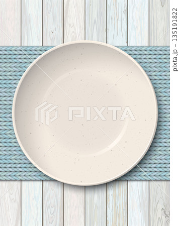 Top view of empty ivory bowl with with grainy texture placed on a light blue placemat on cut timber panel vertical background