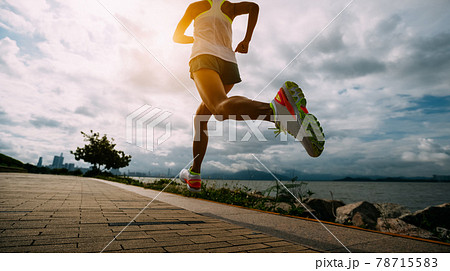 Fitness woman running training for marathon on sunny coast trail