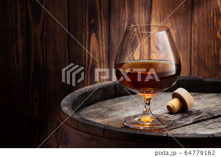 Cognac or Brandy in a glass and fresh grapes, still life in rustic style, vintage wooden background