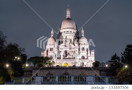 Illuminated Sacre-Coeur Basilica stands on Montmartre hill in Paris, France. Historic white stone church features large dome and Roman-Byzantine architecture in Ile-de-France region