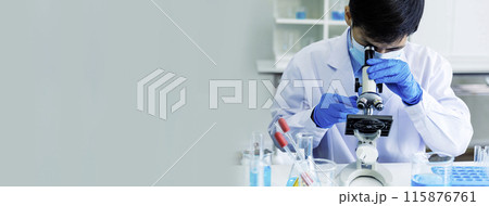 Banner Scientist man look Microscope research in science laboratory. Banner Asian scientist use microbiology microscope in laboratory equipment chemistry lab. Biochemistry experiment with copy space