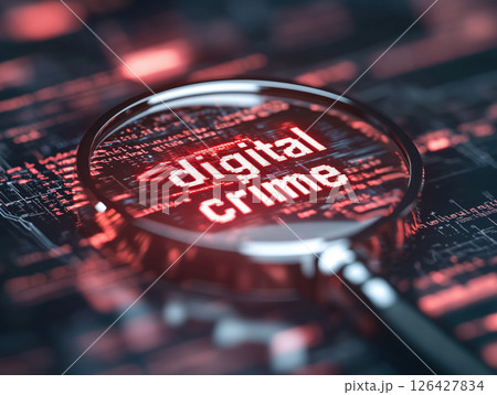 Digital crime magnified through magnifying glass, showcasing technology impact