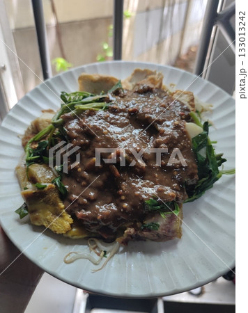 Rujak Petis, a mixed salad lathered with a thick savoury sauce of shrimp paste and smashed peanut. A traditional fruit and vegetable salad dish commonly found in Indonesia.