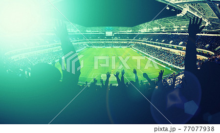 A soccer field with a large crowd of people spectators fans watching the game on sunset. The stadium is lit up with bright flood spotlights ready for a match game