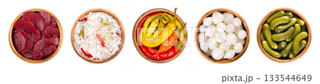 Pickled vegetables in wooden bowls. From left to right beetroot slices, puszta coleslaw, peperoni peppers, pearl onions, and crunchy gherkins, conserved in a vinegar brine with herbs and spices.