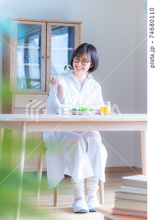 吃在早晨的陽光下的年輕女子