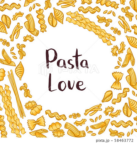 Round frame with different types of traditional pasta and wheat ears. Italian pasta set, label, restaurant menu, background. Food illustration.