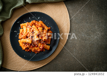 rigatoni pasta with spicy sausage, and rich tomato sauce served, on a white plate, homemade,