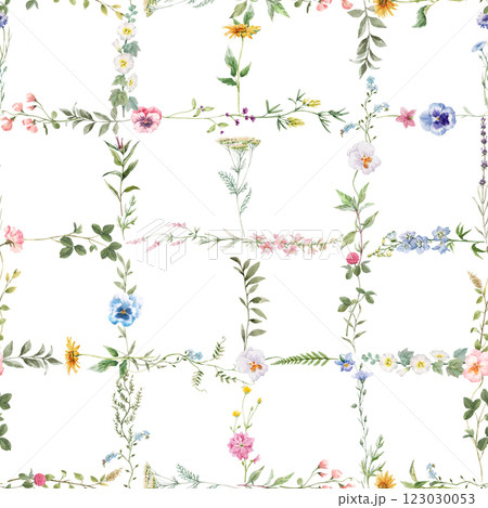 classic watercolor pattern with blue frames, stripes and flowers. cute print for wallpaper and textiles