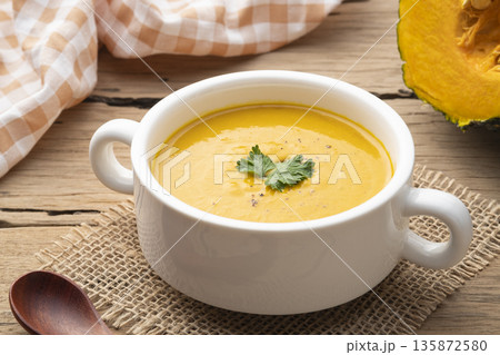 pumpkin carrot cream soup in white bowl,garnished with parsley.Healthy food