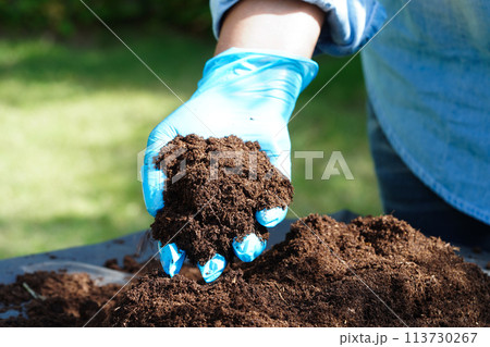 Gardener woman holding peat moss organic matter improve soil for agriculture organic plant growing, ecology concept.