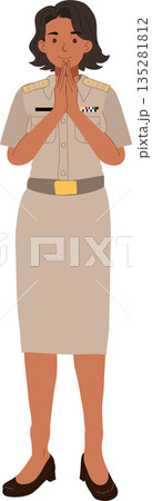 thai civil servant woman performing wai traditional greeting full body illustration