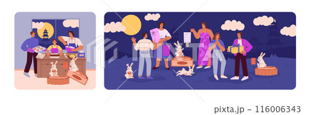 Mid-Autumn Festival vector scenes with mooncakes, characters and bunnies.