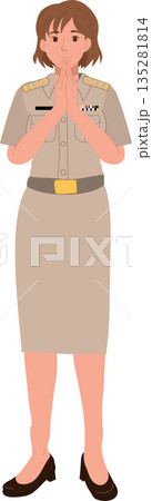 Thai government officer woman in official uniform standing and performing wai greeting, representing respect and professionalism in Thai public service culture