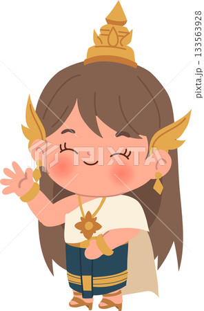 adorable chibi thai character in cultural dress with gold ornaments for asia themed illustration uses