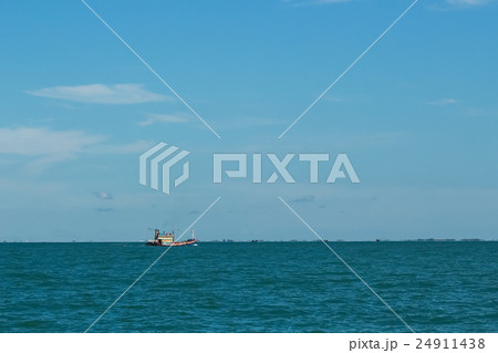 minimalist of single fishery boat on calm sea