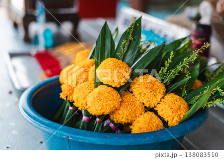 Marigold flower offerings arranged in bowl at Buddhist temple in Thailand