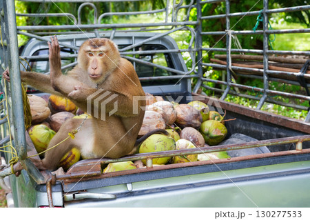 coconut harvesting and monkey on the truck