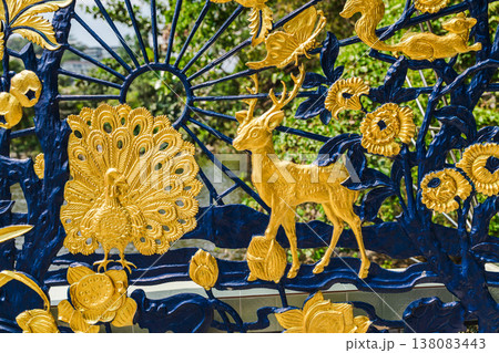Ornate decorative relief with golden animals and floral patterns at Plai Laem temple Koh Samui
