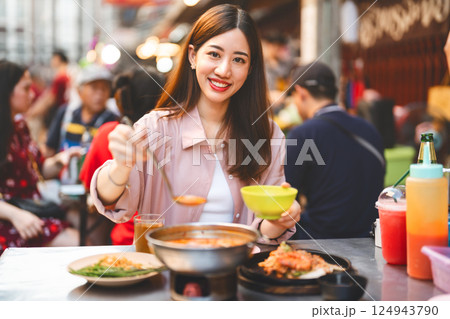 Traveler woman enjoy eating street food spicy thai tasty menu travel at chinatown Yaowarat, Bangkok, Thailand