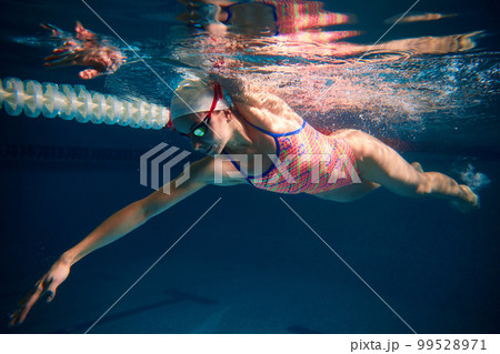 Activity. Young sportive woman, professional swimmer training in swimming pool indoor. Wearing cap and goggles. Underwater view. Concept of sport, endurance, competition