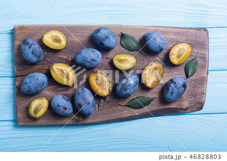 Fresh sweet plum fruits whole and sliced in plate with rosemary leaves on old cutting board with red currant berries in wooden bowl