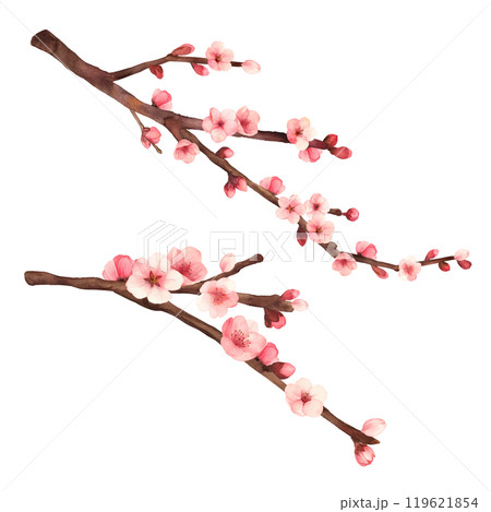 Ripe plum and branch with flowers. Plum drawing watercolor isolated on white background. Watercolor