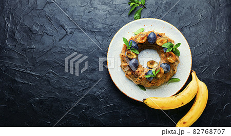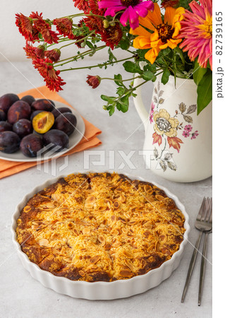 Plum galette with cup of tea. Grey wooden background. Close up. Top view.