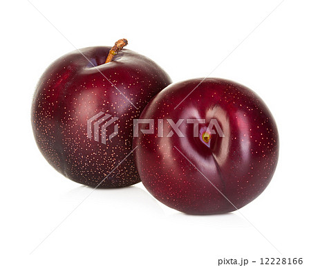 plums with leaf isolated on a white background with copy space for your text. Top view. Flat lay