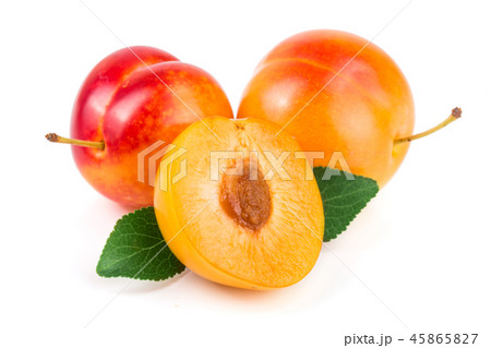 Freshly harvest Marian Plum fruit a whole and a half with leaf on white background.