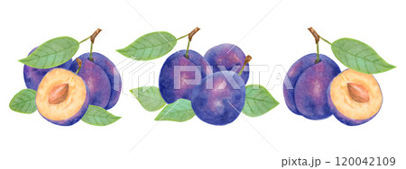 Plum fruit. Berry composition set. Watercolor and marker illustration. Hand drawn isolated art. Botanical plant art with fruits for food or juice packaging design. Harvesting, production.