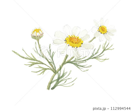 Chamomile Flower. Watercolor botanical illustration of Daisy. Hand drawn clip art of white chamomilla on isolated background. Drawing of bouquet of marguerite. Painting of floral herb