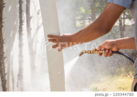 cleaning terrace with a power washer - high water pressure cleaner on wooden terrace surface