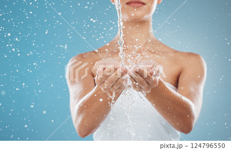 Skincare, hands and woman with splash of water for cleaning, washing and facial cleanse. Wellness, hydration and girl with liquid stream for luxury spa, beauty and hygiene in blue background studio