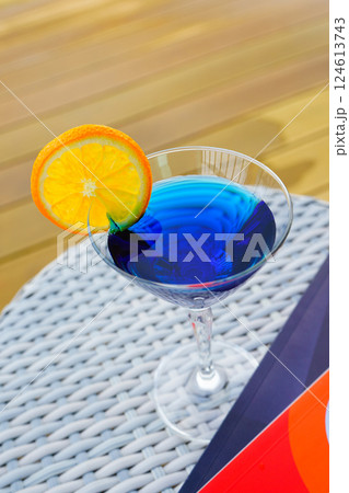A refreshing blueberry soda fruit drink with some orange on top of the glass. vacation drink Relax by the rooftop pool at one of the hotels in Thailand.