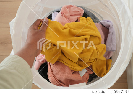 Old clothes thrown into the trash can. Disposal and recycling of clothes.