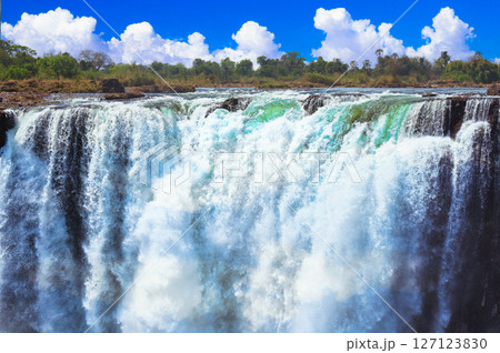 Beautiful cloudy landscape with morning sun rays over Victoria Falls.