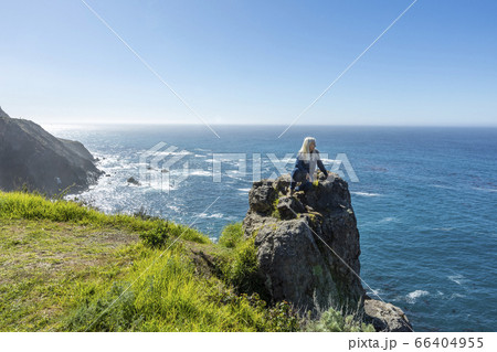 USA, California, Big Sur, Woman sitting at the edge of cliff looking at view