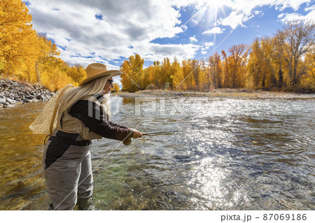 USA, Idaho, Bellevue, Portrait of senior woman fly-fishing in Big Wood River in autumn