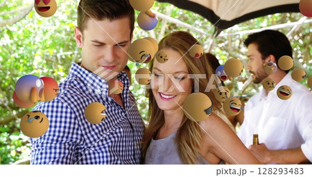 Couple enjoying outdoor party surrounded by floating emoji symbols, smiling together